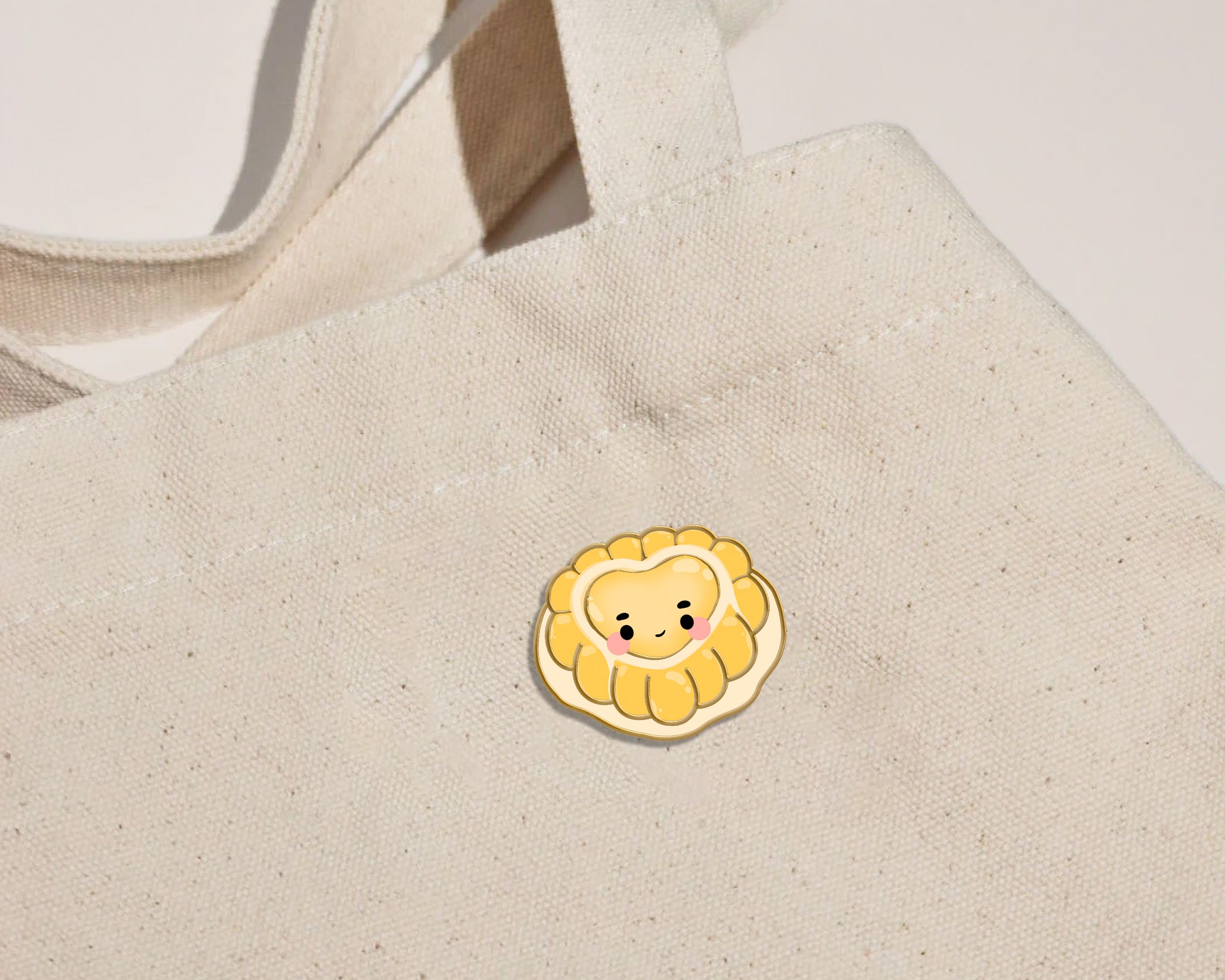 An adorable mango pudding enamel pin for your tote bag, backpack, ITA bag or clothing! This is a cute addition, made with high quality enamel and gold metal finishes.